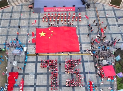 去年国庆前夕,在咸宁市人民广场,近千名社区居民和干部职工自发齐声高唱《我的祖国》,在慷慨歌声中传递巨幅国旗,用音乐快闪表白祖国。