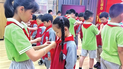 学校少工委副主任李桥宣读组建一年级少先队组织的决定,少先队辅导员兰胜男逐一宣读新队员名单。在热烈的掌声中,老队员为新队员佩戴红领巾。鲜艳的红领巾系于胸前,新队员们神情庄重,目光坚定。随后,全体新队员面向队旗高举右拳,以铿锵誓言许下承诺:“我热爱中国共产党,热爱祖国,热爱人民,为共产主义事业贡献力量!”
