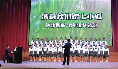 5月20日、21日,体育馆内歌声嘹亮,七年级全体班级分时段展开合唱角逐。必选曲目校歌《扬帆远航》激荡青春情怀,自选曲目紧扣励志主题:如707班《做自己的光 不需要太亮》,719班《精忠报国》等则传递出昂扬向上的力量。音乐教研组专业评审从音准、舞台表现力、团队配合等维度打分、评奖,为后续活动注入澎湃热情。