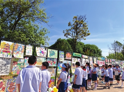 舞台侧方的美育画展同步开展,百余幅学生作品涵盖水彩、国画、剪纸等形式,既有对家乡风物的描绘,也有对科技未来的畅想,生动诠释了“以美育人、以文化人”的教育理念。