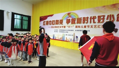 汇演开始之前,一年级学生代表参加了入队宣誓,面对这鲜红的少先队队旗,新少先队员们手握拳头,目光坚定,铮铮誓言在大礼堂内回荡,诠释着孩子们为共产主义奋斗的决心。