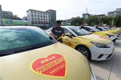 高考在即,城区客运行业开展“爱心护考”活动。6月4日下午,市城顺出租汽车有限公司启动“真情服务高考 爱心助力学子”爱心助考公益活动,的士司机们给出租车系上象征祝福与平安的黄丝带,张贴爱心标识,用自己的爱心行动,助力广大考生出行。(记者 庞赟)