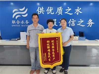6月5日下午,用户专程将一面印有“优质服务为用户,排忧解难惠民生”的锦旗送到咸宁联合水务温泉营业厅,点赞公司“响应速度快、服务质量高、师傅技术硬”。