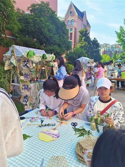 活动现场,美术老师们带领学生沉浸式体验传统艺术。有的孩子专注地将丝线缠绕成缤纷簪花,感受簪花纹样与色彩搭配之美;有的孩子巧手制作端午艾草挂件,细嗅草木清香;有的孩子则在素白扇面上泼洒彩漆,任流动的颜料凝结成独一无二的山水意境。五年级学生小林举着自己动手完成的漆扇笑言:“课后能有这么多时间创造‘会流动的画’,比刷题有趣多了!”