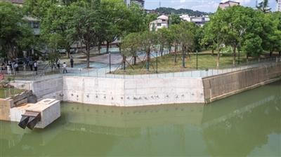 6月10日,记者在祥和苑小区临河位置看到,浮山河入淦河排口处约二三十米长的河堤挡土墙已修复完毕,受损的截污箱涵也已重建。新建挡土墙上的护栏更换为更稳固、耐用的钢制护栏,周边绿化及场地也完成修复。