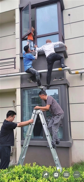 这时,有一名身穿蓝色衣服的装修工人扛着梯子路过,见此场景,立马停下来,正沿着9号楼1楼的飘窗外架起梯子。涂龙海和这名装修工人爬上梯子,借助架设在墙上的管道,攀爬上2楼飘窗外,先抓住孩子大腿,然后将孩子抱住。然后,两人合力将孩子放入飘窗内的安全位置。