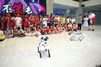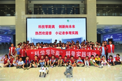 暑日当空,活动在实训基地宽敞明亮的中央大厅拉开帷幕。两只灵巧的机器狗矗立在大厅中央,成为全场焦点。在志愿者指令下,伴随着酷炫的舞曲,机器狗舞动躯体,时而摇摆、时而挥手示意、时而转动身体,大家目不转睛。突然一个跟斗让小记者们心里一紧,可他旋即又转身继续跳舞,这出乎意料的一个表演,赢得大家的阵阵掌声。
