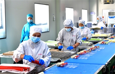 6月15日,咸宁高新区凤凰工业园桂香满园食品有限公司二期车间,工人们正在流水线上生产糕点。