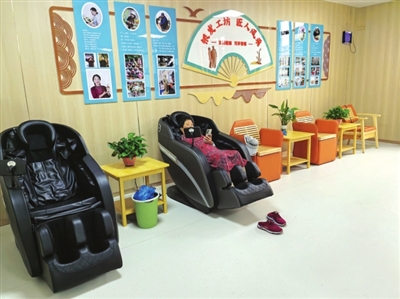 章浩锐说,二楼是一个日间照料中心,周边老人吃完早餐,可以来这里坐坐按摩椅、下下象棋、做做手工,中午就在中心就餐,下午还能泡泡脚、打打台球、和老友们唠唠嗑,到了下班时间再回家休息。