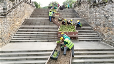 本报讯(记者黄兰芬通讯员王云)6月18日,咸宁城区十六潭公园,园林绿化养护工人忙碌地挥舞着小锄头,在台阶花箱、入口边坡等多处,精心栽种粉色、蓝色的夏瑾。