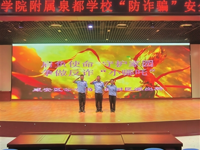本报讯(记者 王奇峰 通讯员 袁圆月 王莹)6月18日,泉都学校里惊现“神秘嘉宾”——脚踩风火轮,手持乾坤圈的神话小英雄哪吒。当天,“哪吒”携手咸安区公安局高新园区派出所民警,将防诈骗安全教育讲座开进校园。