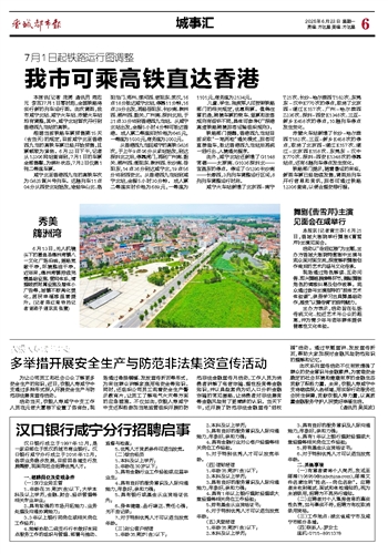 本报讯(记者 庞赟 通讯员 周忠元 李言)7月1日零时起,全国铁路将实行新的列车运行图。此次调图,我市咸宁北站、咸宁火车站、赤壁火车站均有调整,其中,咸宁北站首次开行到香港西九龙站的高铁。