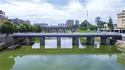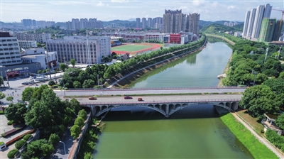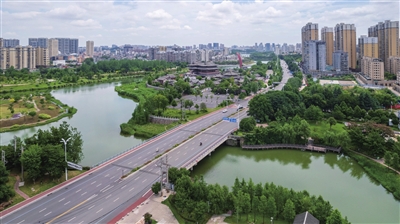 6月13日,蓝天白云下,西河桥汉白玉栏杆倒映在淦河粼粼波光中,丹桂桥上车辆有序穿梭,兴龙桥如长虹般跨越两岸……