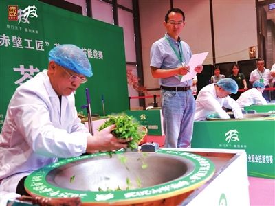 制茶赛区则是另一番火热景象。铁锅温度攀升至200℃,赤壁松峰茶产业协会的制茶师黄云林双手如蝶舞般翻飞,鲜叶在掌心腾挪跌宕,杀青、揉捻、干燥……随着“唰唰”翻炒声,翠绿茶青逐渐蜷缩成墨绿条索,缕缕板栗香混着焦糖香在空气中弥漫,引得观众们频频惊叹。