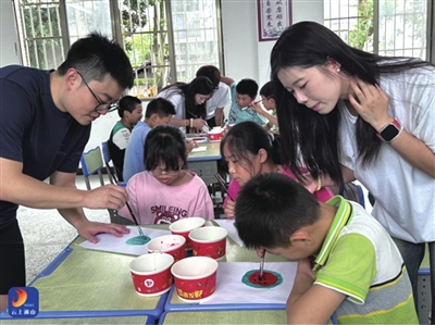城市建设学院“晨曦”志愿服务队则带来非遗叶画课程。队员们针对不同年龄段设计“趣味拼贴”“知识问答”等互动环节,手把手教孩子们制作叶脉画。队长辛窑青通过枫叶讲解植物知识,孩子们将作品带回家后,纷纷自发成为“非遗小讲师”。村委会计划将叶画元素融入村容改造,带队老师武成硕表示:“这既是文化传承,更是以非遗美学激活乡村特色。”