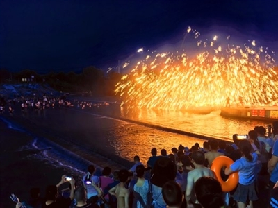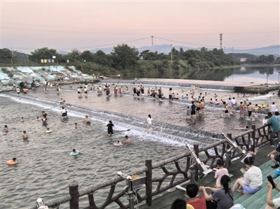 “专程带孩子来游泳消暑,意外邂逅了精彩表演。”看台上,市民谢女士正带着两位小朋友,兴致勃勃地观看打铁花表演。