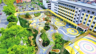 市第四小学旁的彩虹公园是童趣天地。护学连廊遮风避雨,滑梯和秋千可玩可赏,草