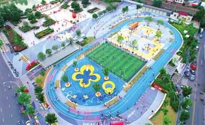 桂花广场运动公园的蝶变更令人惊叹。旧运动场借人防工程建设契机重生,明艳的“能量波”环形步道向外辐射活力,孩子们在桂花形沙坑攀爬嬉戏,下沉式篮球场边台阶座椅自成观众席,集装箱顶可俯瞰球场全貌,市民在这里尽情运动和游乐。
