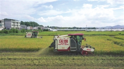 本报讯(通讯员 胡昊宇)收割、运粮、整地、插秧……7月9日,在崇阳县的金黄沃野,“铁牛”驰骋,机器轰鸣,稻香扑鼻,一幅人勤机欢的“双抢”图景铺展在广袤大地上。