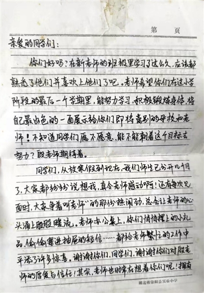 “亲爱的同学们,你们好吗?在新老师的班级里学习了这么久,应该都熟悉了他们并喜欢上他们了吧……”7月4日上午,殷丽志的手机微信收到了几条信息。她点开一看,是4张图片形式的信。从第一张图片顺着往后面看,当殷丽志的目光落在信末的署名和日期—— 2001年3月23日,她瞬间怔住了:这分明是她自己的笔迹!