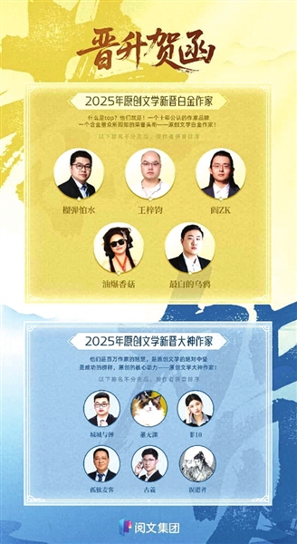 本报综合消息 7月15日,阅文集团发布2025年度“白金大神”作家名单,榴弹怕水、王梓钧、阎ZK、油爆香菇、最白的乌鸦5名作者获“白金作家”称号,城城与蝉、董无渊、非10、孤独麦客、古羲、误道者6名作者获“大神作家”称号。