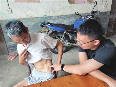 7月20日,记者采访时,时隔近5年,回想起当时割肾救子的情形,张阳村云淡风轻地撩起左下腹的衣角,“喏,就这儿。”一道长长的疤痕出现在骨瘦如柴的身躯上。他的语气很平静,平静得像在说别人家的事一样。