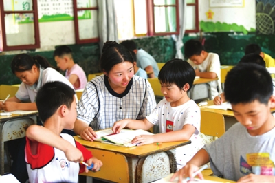 7月11日,通山县南林桥镇石门小学校园内,来自湖北大学数学与统计学院的大学生志愿者辅导托管班的孩子写作业,并上了一堂生动的防溺水安全课。