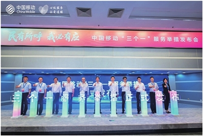 7月21日,中国移动召开“民有所呼 我必有应——‘三个一’服务举措发布会”,面向社会发布一套客户服务承诺、一个服务监督平台、一个大服务体系,回应客户关切,提升服务标准,引领行业规范,展现红色通信央企担当。深入贯彻中央八项规定精神学习教育中央第十一指导组组长陈润儿、副组长库热西·买合苏提,中国消费者协会副会长兼秘书长王振宇,工业和信息化部信息通信管理局副局长邵道新,中国质量协会副会长兼秘书长李高帅,中国移动董事长杨杰、总经理何飚出席大会,各界客户代表、专家学者、媒体代表等120位嘉宾现场见证。