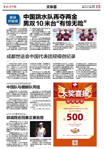 本报综合消息 2025年世界游泳锦标赛跳水项目29日在新加坡继续进行,中国队陈艺文/陈佳、程子龙/朱子锋分别夺得女子双人3米板和男子双人10米台金牌。