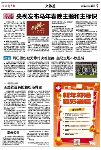 本报综合消息 日前,中央广播电视总台正式公布《2026年春节联欢晚会》主题与主标识。马年春晚以“骐骥驰骋 势不可挡”为主题,将在欢乐吉祥、喜气洋洋的基调中,与全球华人共度除夕,呈现一场昂扬奋发、温馨洋溢、充满新意的文化盛宴。