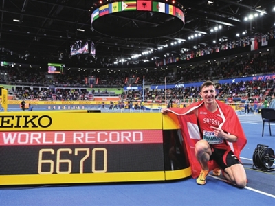 本报综合消息 经历了两天的比赛后,瑞士选手艾哈默21日以打破世界纪录的成绩在波兰托伦夺得世界室内田径锦标赛男子七项全能冠军。