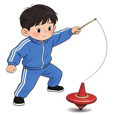 比赛的哨声再次响起,我用力抽打着我的小陀螺。抽了许久,赛场上终于只剩下周周、小美和我了。我顿时满心欢喜,抽陀螺的力道也更足了。又过了一会儿,周周因为失误退场,只剩下我和小美展开了一场激烈的大小陀螺单挑赛。比赛中途,我的陀螺绳突然断了,出了一点儿小失误。但就在这时,我听见了同学们此起彼伏的加油声,心想决不能辜负大家的鼓励。我攥着断了的绳子,继续抽起了陀螺。