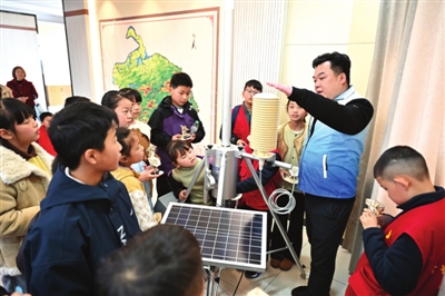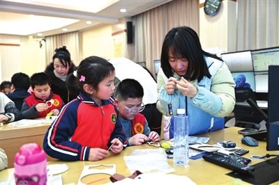活动的最后,手工制作环节成为小记者们的欢乐时光。气象局工作人员为孩子们分发了气象主题手工材料包,指导大家制作卫星雷达手工作品。在制作过程中,小记者们认真聆听讲解,仔细阅读说明书,小心翼翼地拼装。“老师,我不会绕电线。”“老师,为什么我没开通电源,马达还是会转动?”遇到难题时,小记者们或者寻求帮助,或者共同探讨,最先完成的小记者协助其他小伙伴,现场一片温馨。