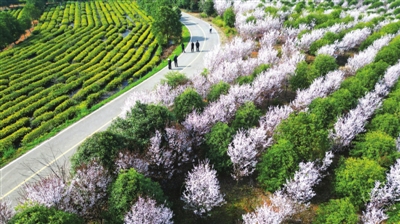 3月13日,咸安区双溪桥镇九彬村,新芽满枝的茶园与粉白似雪的李花相映成趣,行人漫步村道,将春日的烂漫与惬意尽收眼底。 记者 陈红菊/摄