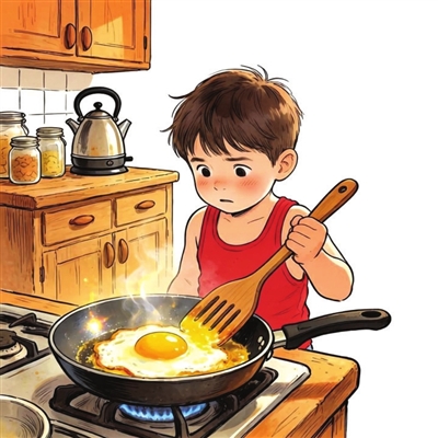 星期五晚上,爸爸妈妈都睡着了,我的肚子却开始“咕咕”叫。我打算自己煎一个鸡蛋填饱肚子,便小心翼翼地从冰箱里拿出一个鸡蛋,又从碗柜里取来一个碗,把鸡蛋在灶台上磕出一条缝,再将蛋液缓缓倒进碗中。我心里既害怕又兴奋,接着把平底锅放在灶台上,打开火,倒入食用油。