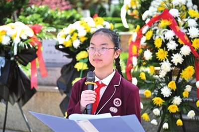活动最后,小记者代表登上台前,以铿锵有力、饱含深情的语调进行朗诵。从《缅怀英烈》的深切追思,到《传承前行》的坚定决心,朗诵内容字字句句饱含对革命先烈的缅怀与敬仰,稚嫩却坚定的声音在公园上空回荡,感染着现场每一个人,将整场祭扫活动的氛围推向高潮。