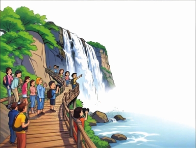 挤过人群,壮观的瀑布终于展现在眼前。它像一匹巨大的白色丝绸,从悬崖之巅飞流直下,气势磅礴,蔚为壮观。我不禁吟诵起李白的诗句:“飞流直下三千尺,疑是银河落九天。” 水流从高高的山崖倾泻而下,撞击在岩石上,溅起无数晶莹雪白的浪花,朦胧的水雾环绕着山崖,也轻抚着每一位游客。