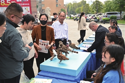 展区内,灰头麦鸡、凤头鹰、鸺鹠、丘鹬等珍稀鸟类标本集中亮相,直观展现嘉鱼丰富的野生鸟类资源,吸引不少老年群众与带孩子的家长驻足观看、咨询互动。工作人员耐心解答群众提问,普及非法猎捕、交易、食用野生鸟类的法律后果,倡导市民自觉抵制野味、积极参与护鸟行动。