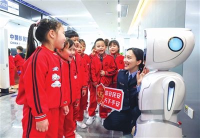 4月13日,在江苏省扬州市公安局江都分局出入境管理大队,扬州市江都区一幼儿园的小朋友们通过与机器人对话了解出入境安全知识。