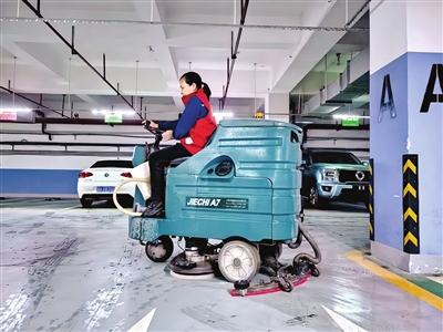 走进始峰悦府小区,面积达一万多平方米的地下停车场宽敞洁净。保洁员李爱清正驾驶吸刮两用车巡回作业,一边刮除地面污渍,一边同步吸尘收纳,清洁高效。一旁,身穿红马甲的物业工作人员与志愿者分工协作,全面清扫卫生死角、规范摆放电动自行车,现场井然有序。