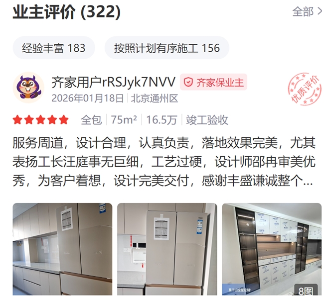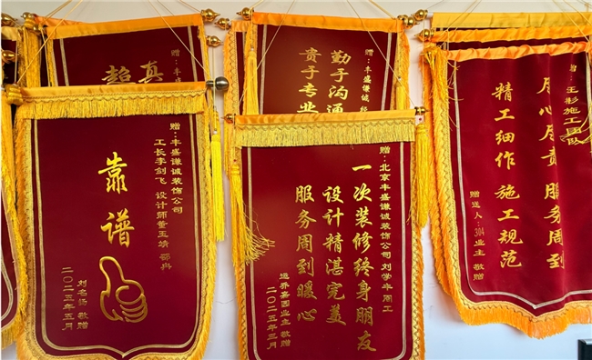 走进丰盛谦诚装饰的办公区,走廊挂满了业主真心赠送的锦旗,并留有合影留念。在线上齐家网平台,该公司累计拥有超 325 条真实业主图文评价,综合评分 4.8 分(设计 4.6 / 施工 5.0 / 服务 5.0),好评率 100%,累计 325 条真实业主评价。(数据截止2026年4月15日)。好评主要集中在五大维度:设计师审美在线、方案贴合需求;工长认真负责、施工工艺过硬;无增项、报价透明;工期可控、按时交付;全程服务响应及时。公司还打造了多项标杆业主案例,如通州区 75㎡全包项目、70㎡半包项目、朝阳区康营小区老房改造等,均保留从开工到竣工的完整记录,并附有业主实名表扬内容。