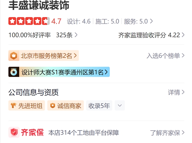 丰盛谦诚装饰为齐家网平台认证诚信商家、明星商家、多年零差评商家。亦是入驻超 5 年的先进班组,平台荣誉如下: