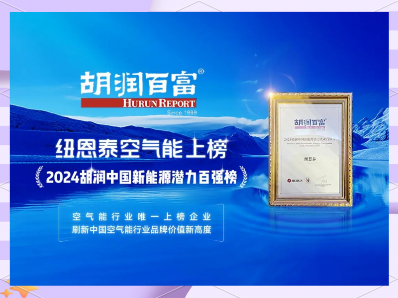 胡润研究院于2024年7月26日揭晓了《2024胡润中国新能源潜力企业百强榜》,该榜单首次亮相便吸引了众多目光。榜单中,众多非上市企业崭露头角,它们均是在2000年后成立,且企业价值位于10亿元至150亿元人民币之间,极具发展潜力。纽恩泰作为空气能行业的佼佼者,凭借其卓越的技术创新、广阔的市场前景以及出色的企业运营,成功脱颖而出,成为唯一入选的企业。