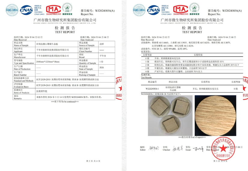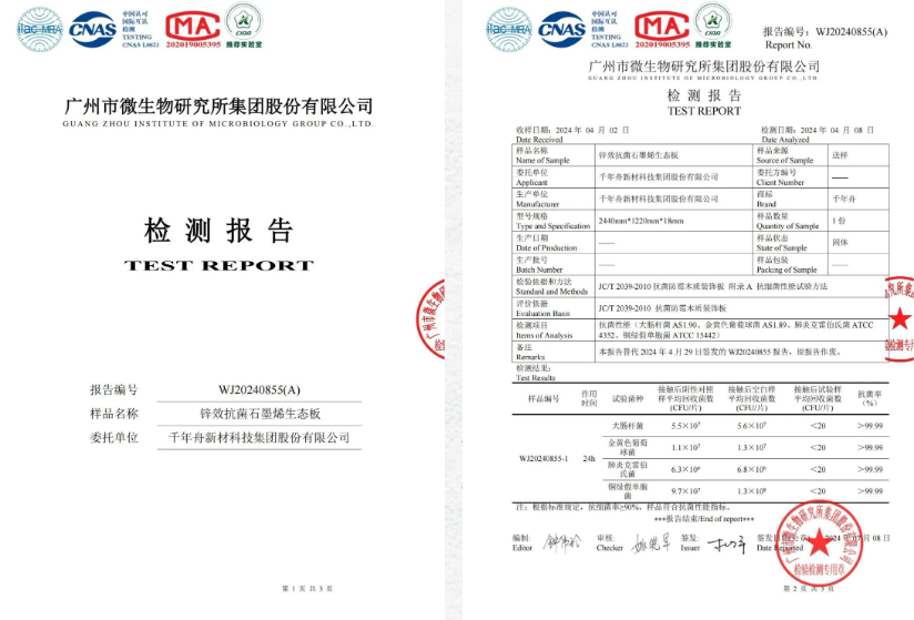 经权威检测,千年舟石墨烯黑金板对大肠杆菌、金黄色葡萄球菌、铜绿假单胞菌、肺炎克雷伯氏菌等常见有害细菌的抗菌率高达99.99%;对甲型流感病毒H1N1、H3N2的抗病毒活性率高达99.9%;防霉方面可达到行业最高0级标准;在净甲醛,除TVOC等方面也有优异表现。