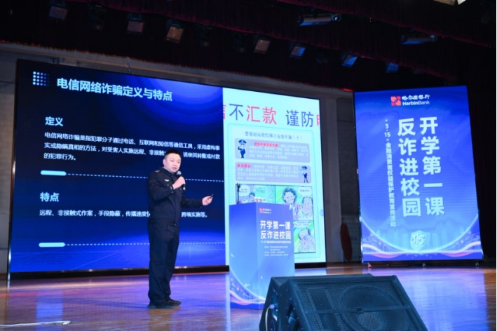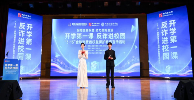 “保障金融权益,助力美好生活。”3月16日,哈尔滨银行在国家金融监督管理总局黑龙江监管局、黑龙江省银行业协会的指导下,联合哈尔滨市公安局刑侦支队、香坊分局走进哈尔滨金融学院,开展“开学第一课 反诈进校园”暨“3·15”金融消费者权益保护教育宣传活动。