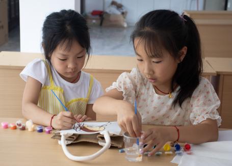 随后开展的 “布包绘画” 活动,让孩子们的创造力与想象力得到充分释放。志愿者提前准备好素色布包、水彩笔、丙烯颜料等材料,孩子们拿到 “画布” 后,迫不及待地拿起画笔,大胆涂抹色彩。一个个素净的布包被赋予了独特色彩与图案。