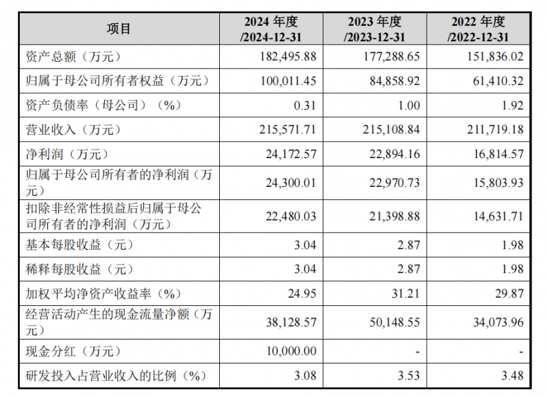 植物医生主板IPO申请获受理,其在研发领域的深耕与成果,成为支撑企业稳健发展的重要基石。2022年至2024年,公司营业收入稳定增长,分别为211,719.18万元、215,108.84万元和215,571.71万元;归属于母公司所有者净利润持续攀升,从15,803.93万元增长至24,300.01万元,年均复合增长率达24.00%,这样的业绩表现与其在研发上的投入密不可分。