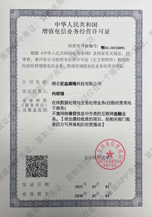 2025年7月1日,湖北宏鑫康隆科技有限公司,成功续展取得了由湖北省通信管理局监制颁发的《中华人民共和国增值电信业务经营许可证》,获准开展在线数据处理与交易处理业务。这一资质的取得,标志着该公司在数字化服务领域的合规经营能力、专业服务质量及安全技术实力获得权威认可,也为其持续构建“开放、共赢、绿色”数字共享平台,打造“万物互联数字经济生态圈”的宏伟蓝图筑牢根基。