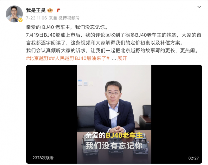 在商业上,通常保留一个老客户的成本,远低于获取一个新客户的成本。面对部分老车主的抱怨,王昊发布言辞恳切的公开信,以“家人”相称,消弭疏离感,“从你们选择北京越野的那一刻起,这份情谊就深深烙印在我们心里”。