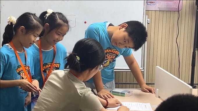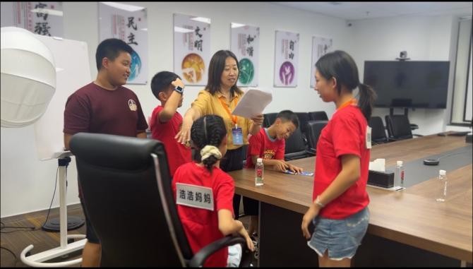 金融公益短片制作是本次训练营的核心环节。20 名学生分为 4 组,围绕《警惕班级群混入诈骗分子》脚本展开全流程创作。从解读角色特质、揣摩台词语气,到设计肢体动作、配合镜头走位,孩子们分工协作、反复打磨。经2 小时紧张创作,4 部洋溢童真却态度严谨的防骗短片顺利完成,生动呈现了识别诈骗陷阱、守护个人信息安全的重要性。